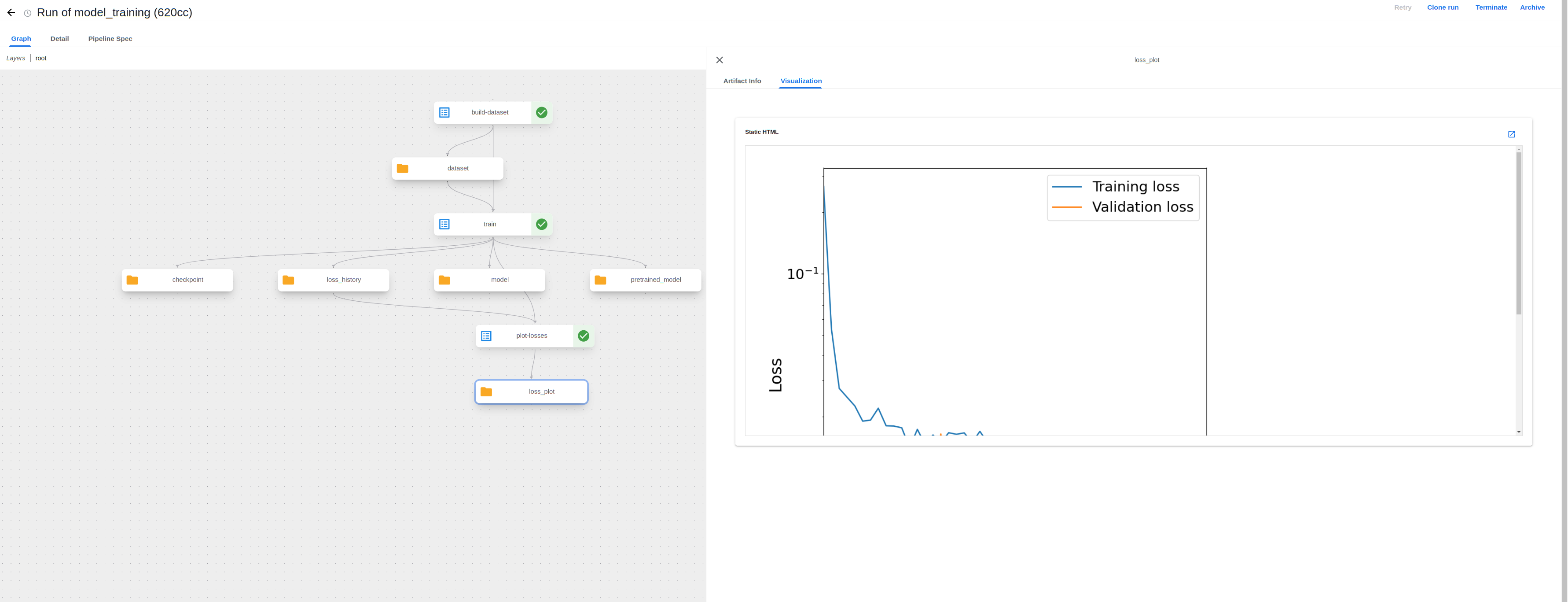 The UI has now been updated to support visualizing output artifacts such as the training loss plot from a MQS ML model fine-tuning pipeline: