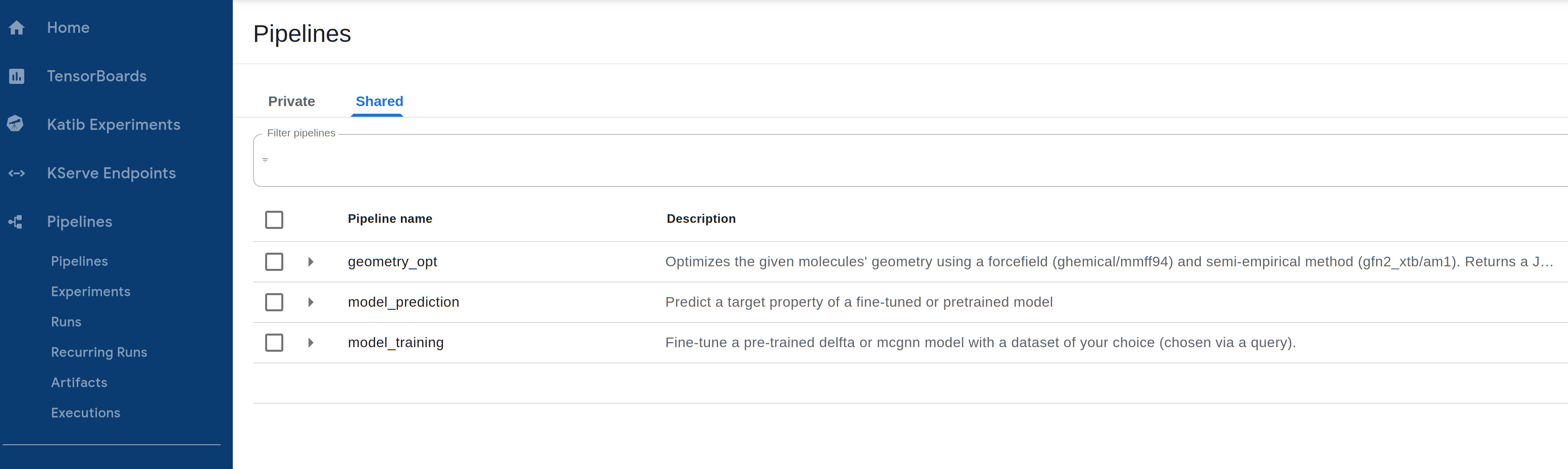For a detailed example of running our Kubeflow pipelines, see our tutorial on the pipelines for training, fine-tuning and using our GNN models to predict molecule HOMO-LUMO gaps.